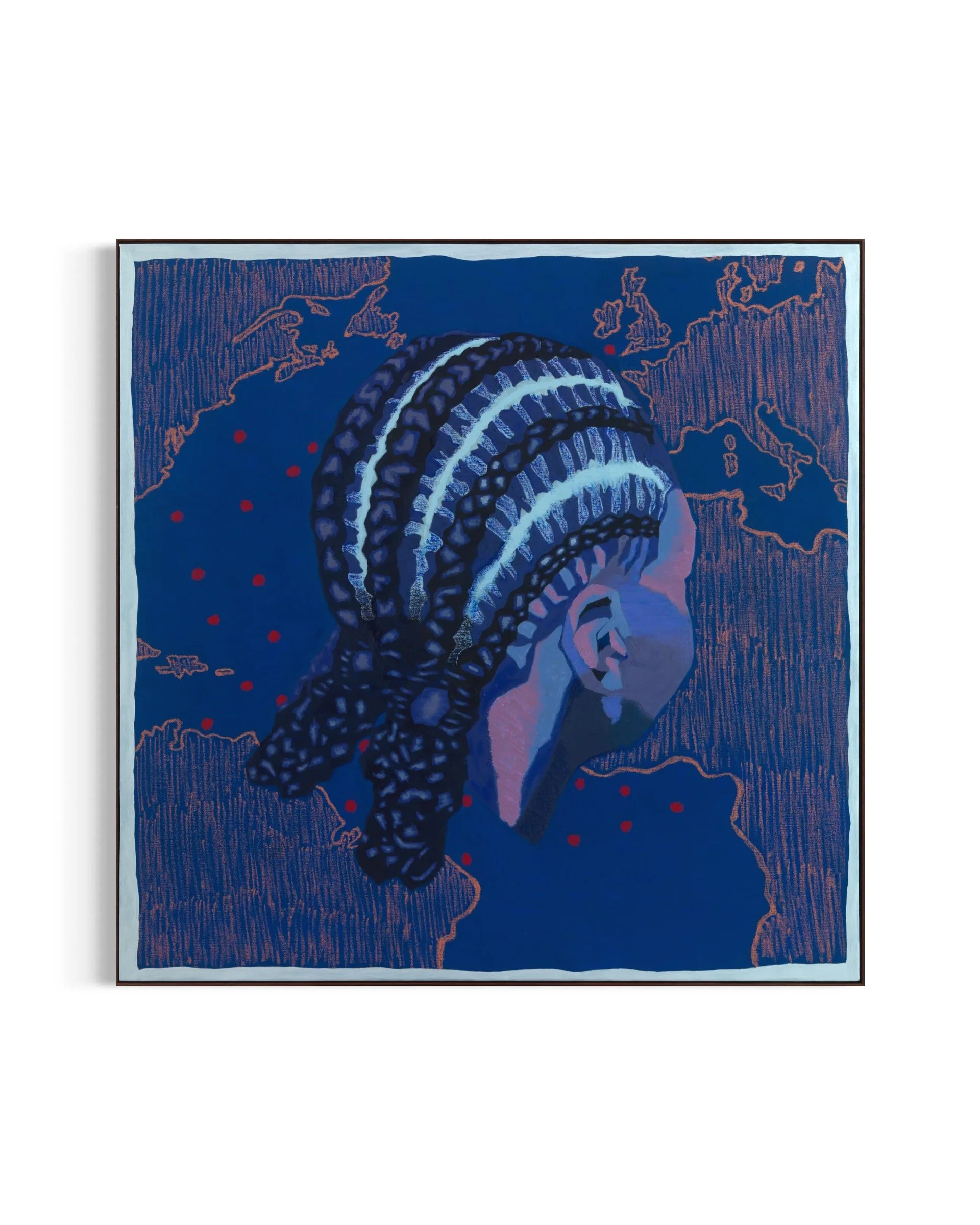 In 1788, Stanley Onah carries us back to the beginning of the braid’s transatlantic journey, a time when hair was both a map and a memory. Against the faint outline of the Atlantic Ocean, a figure wears intricately woven braids that speak to origin, belonging, and survival. Each plait is a thread of lineage, a coded echo of home carried across unimaginable distance.